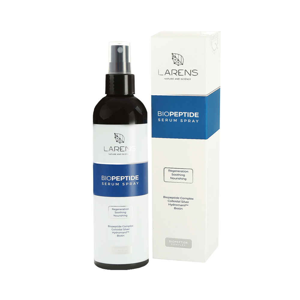 Biopeptide Complex, który jest fundamentem Serum Face, Hair & Body Repair Spray to zbiór aktywnych oligo- i polipeptydów. Rewolucyjne substancje, których odkrycie stanowi początek kosmeceutyków marki Larens szybko uznano za przyszłość kosmetologii i medycyny na polu anti-aging. Peptydy funkcjonują na trzy sposoby: sygnałowe – dają impuls i pobudzają fibroblasty do produkcji kolagenu i elastyny, rozkurczające – nazywane ,,żelazkiem do zmarszczek”, rozluźniają mięśnie, których napięcie skutkuje zmarszczkami mimicznymi, transportujące – przenoszą składniki aktywne serum w głąb skóry, dzięki czemu regeneracja, odżywienie i ochrona zaczynają się od postaw.